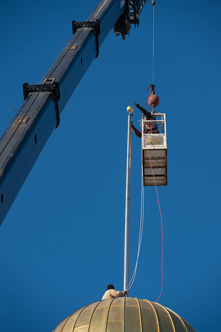 By late morning Thursday, with the help of two Facilities Management staff in a work cage attached to a crane and a staff member in the dome, the pulley was repaired, the rope was replaced, and the U.S. and State of Iowa flags were hoisted back in place.