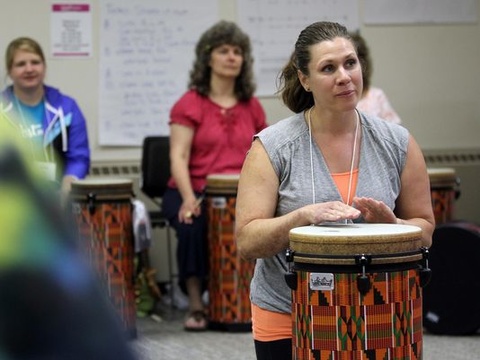 Music teachers jammed to the sound of Tubano drums Thursday at the Iowa Memorial Union in Iowa City. About 60 K-12 music teachers and others gathered for World Music Drumming workshops on the University of Iowa campus, hosted by the UI College of Education and West Music.
