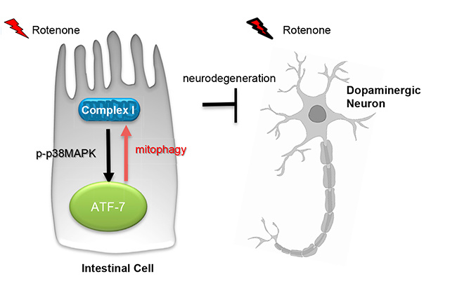 It turns out there was. The roundworms’ immune defenses, activated when the rotenone was introduced, discarded many of the defected mitochondria, halting a sequence that would’ve led to the loss of dopamine-producing neurons. Importantly, the immune response originated in the intestine, not the nervous system.