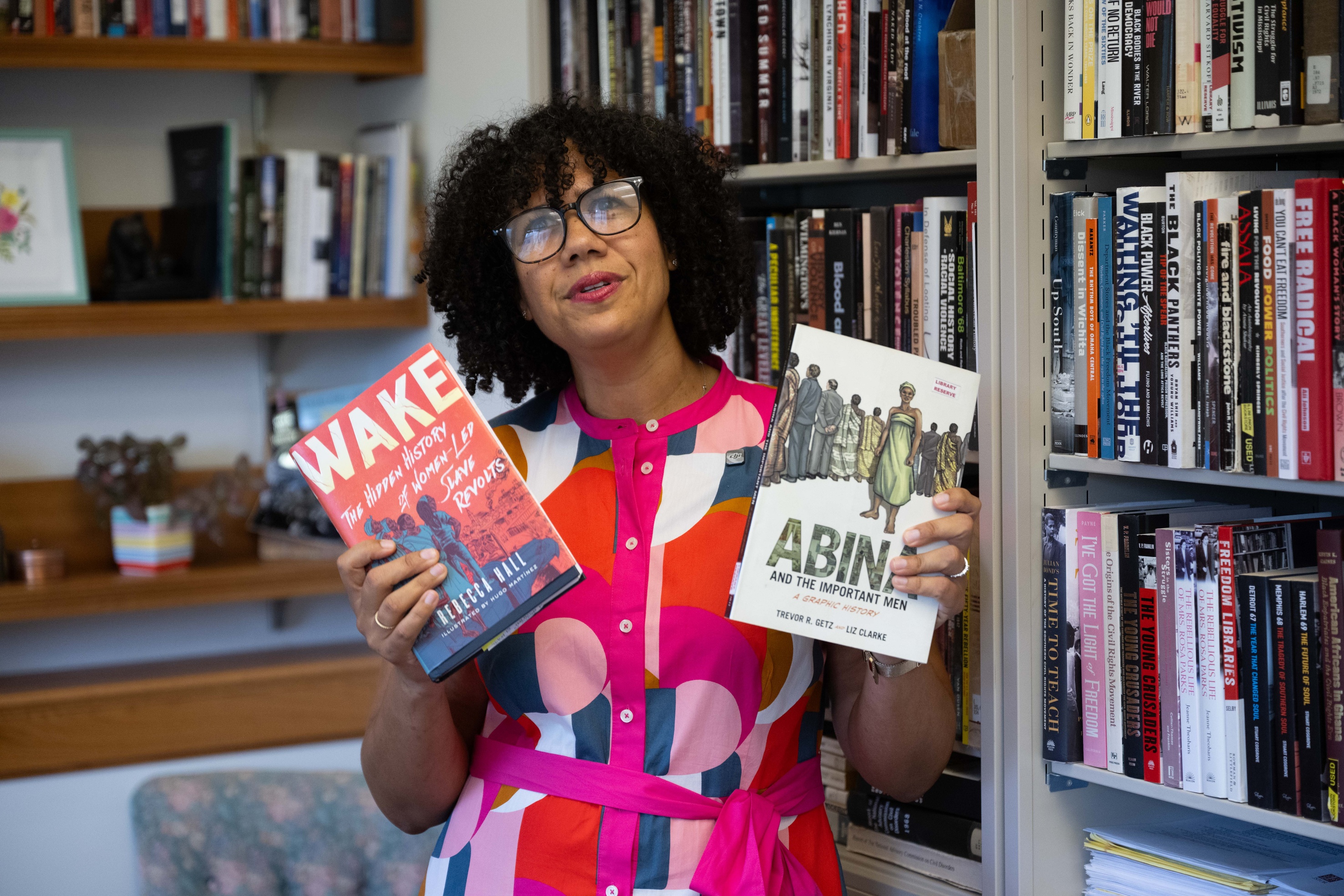 For Howard, an Omaha native who was inspired to earn a PhD in history after reading Carmichael’s autobiography, it’s a line that speaks to the way that her chosen field is about connection. She pulls two favorite books from a shelf to illustrate: Rebecca Hall’s history of women-led slave revolts, Wake (“It shows how we bring our whole selves to history”) and Trevor Getz’s graphic novel, Abina and the Important Men (“It gets at the fact that history is an act of investigation and an act of imagination”).