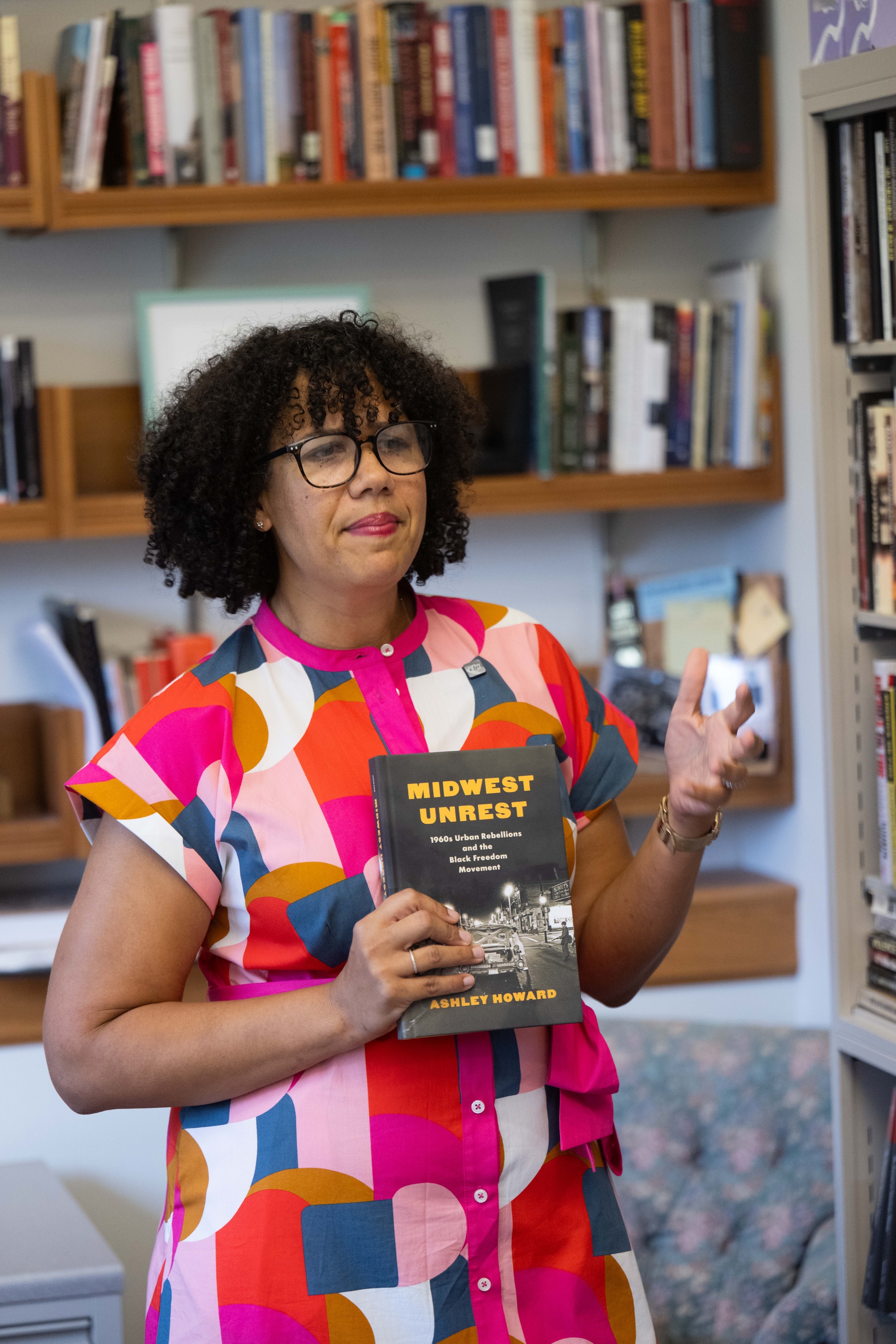 For her first book as an author, Midwest Unrest — an examination of overlooked 1960s urban uprisings in Cincinnati, Milwaukee, and Omaha published in June— Howard drew inspiration from a personal library that fills her Schaeffer Hall office. It’s an ideal of the form, with tall windows overlooking the Pentacrest, intriguing art, and shelves lined with titles she calls classics.