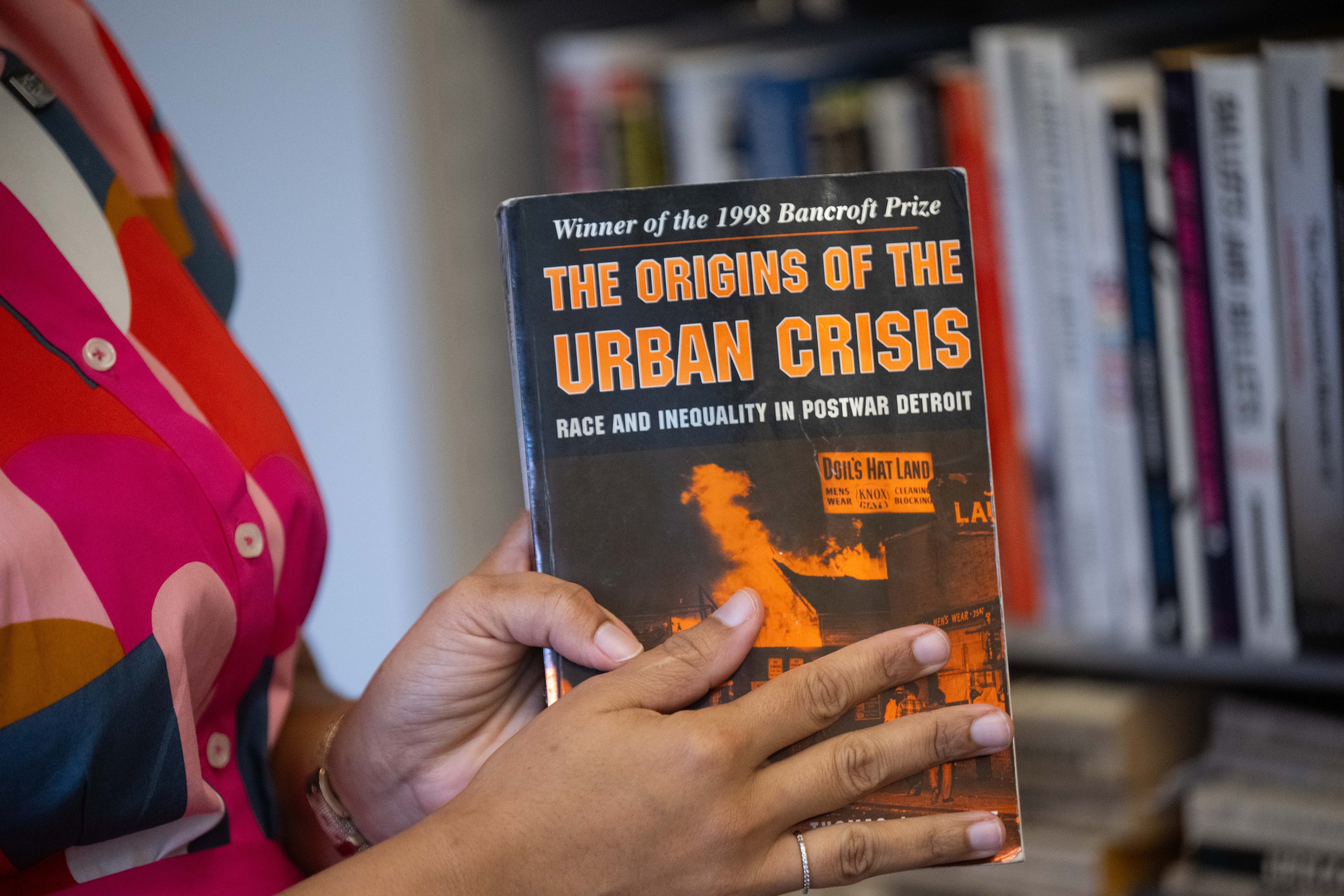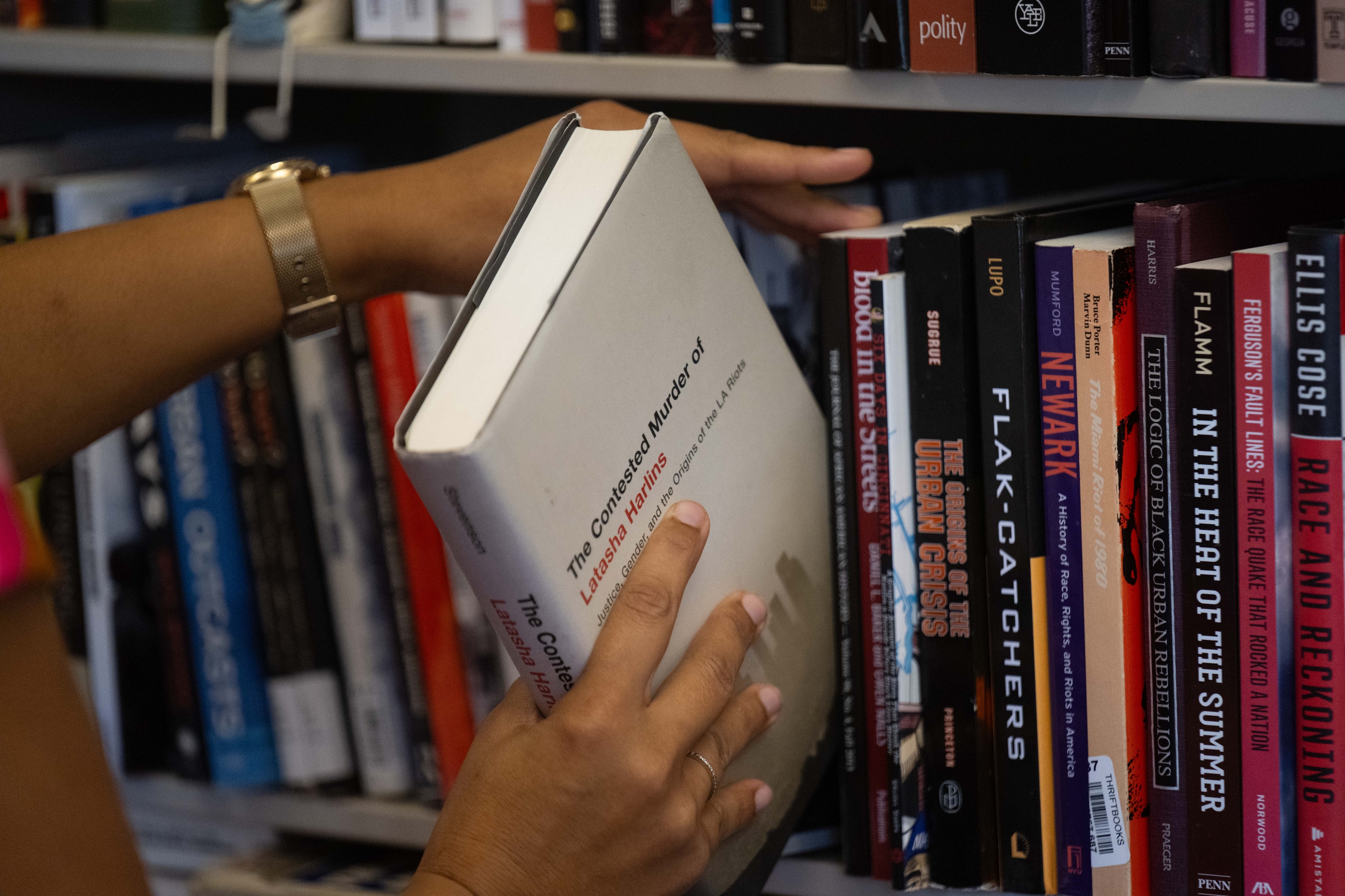 They include a well-worn copy of the 1968 Kerner Commission report on violence and social disparities in America (“I’m a little embarrassed to say I bought this when I was 15,” she says); Gerald Horne’s overview of the 1965 Watts uprising, Fire This Time (“A classic”); and an autobiography of civil rights leader Stokely Carmichael.