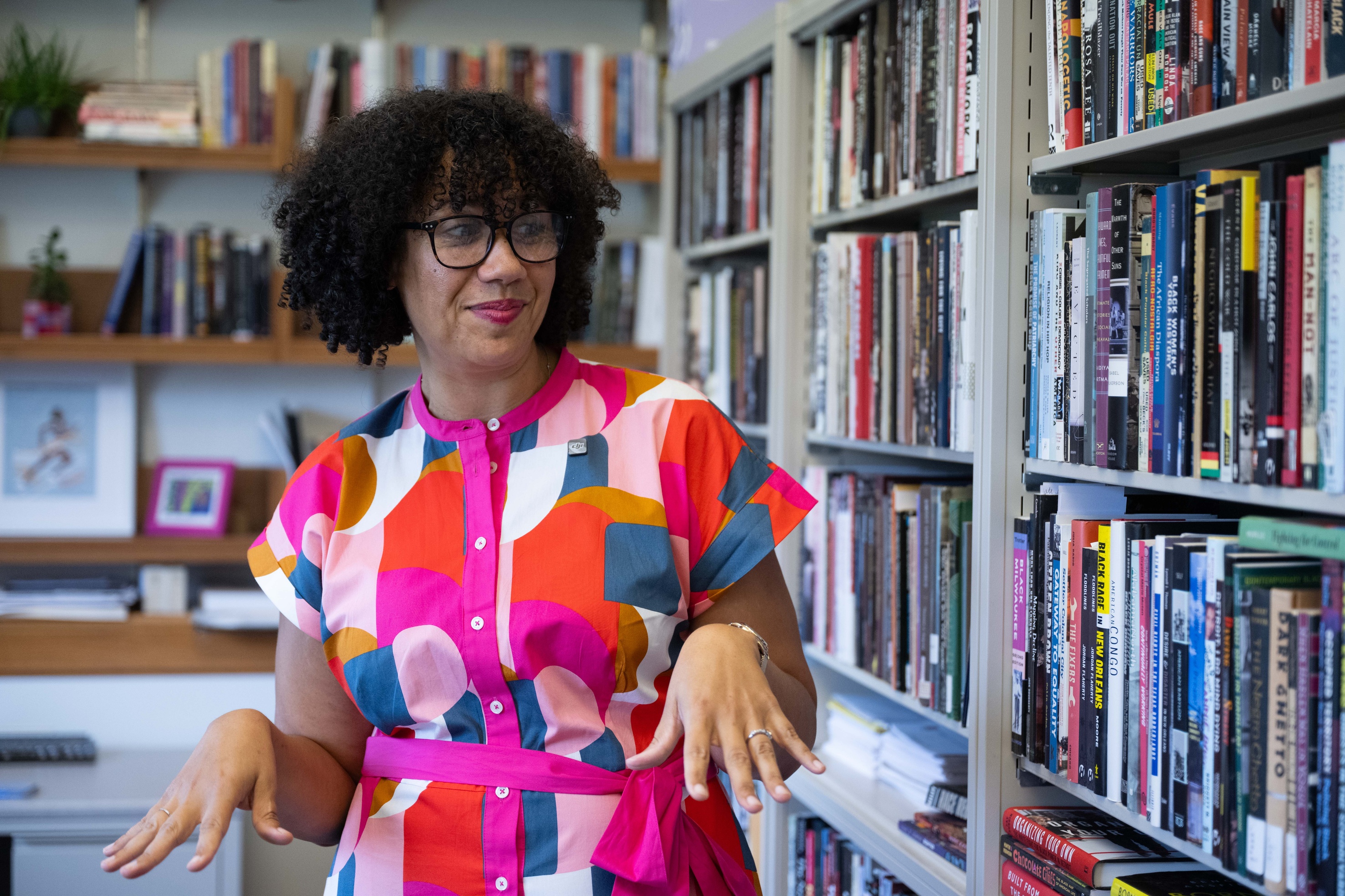 Her library shelves also celebrate UI colleagues, including books from Colin Gordon, Tara Bynum, and Richard Turner. “This has been really one of the best parts of coming to Iowa is that I’m dually appointed — I get to do what I do as a historian, but I also get to think more broadly about the human experience and the histories that aren’t in an archive,” she says.