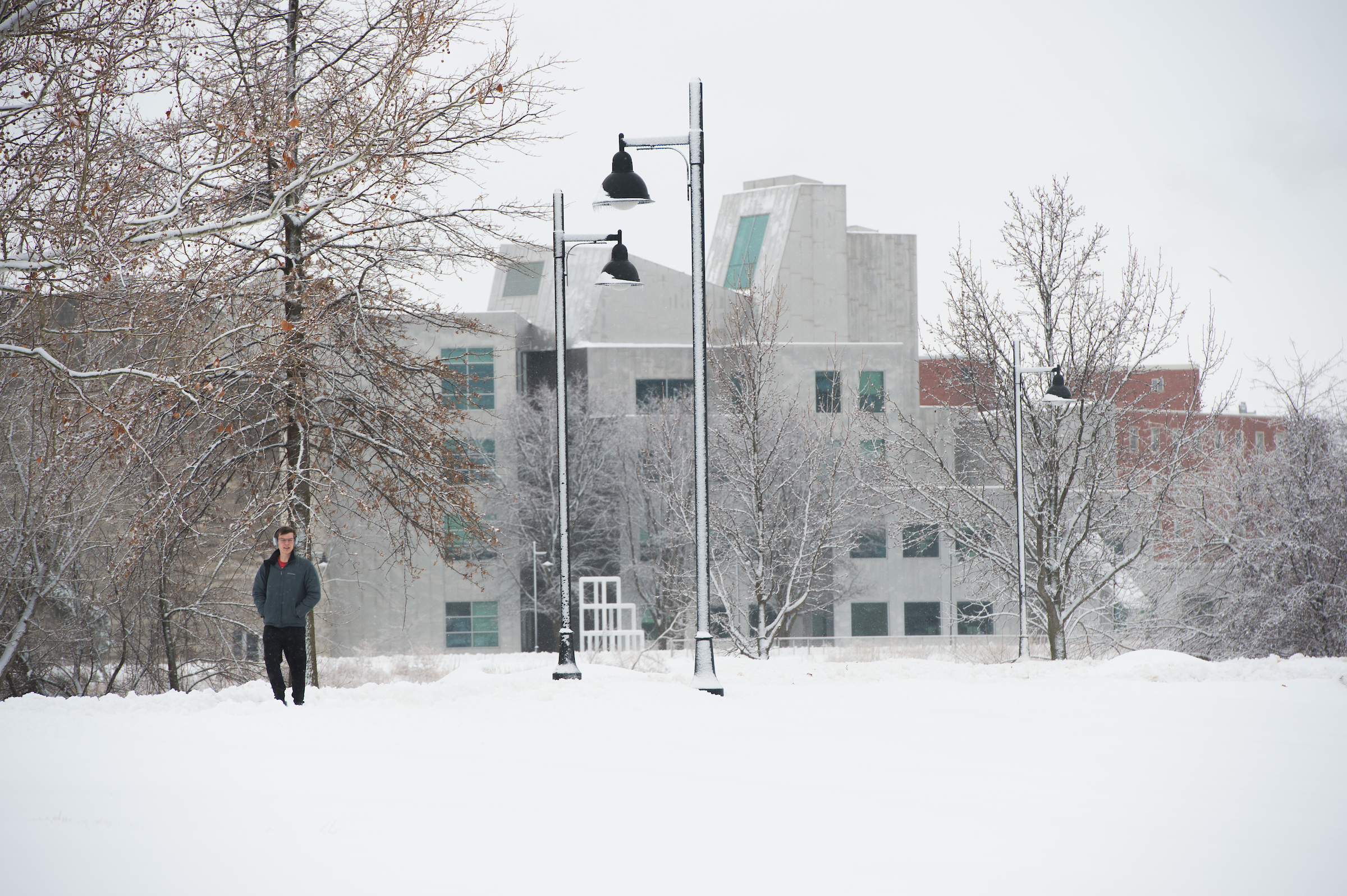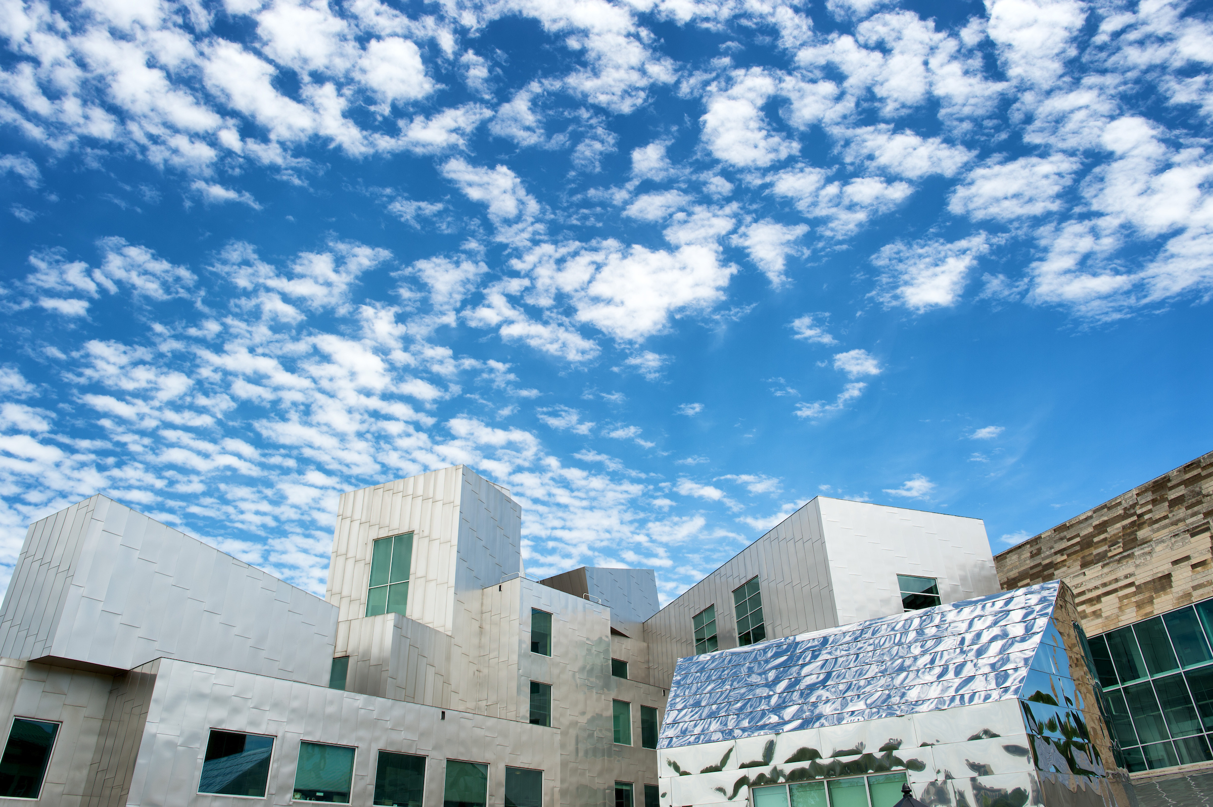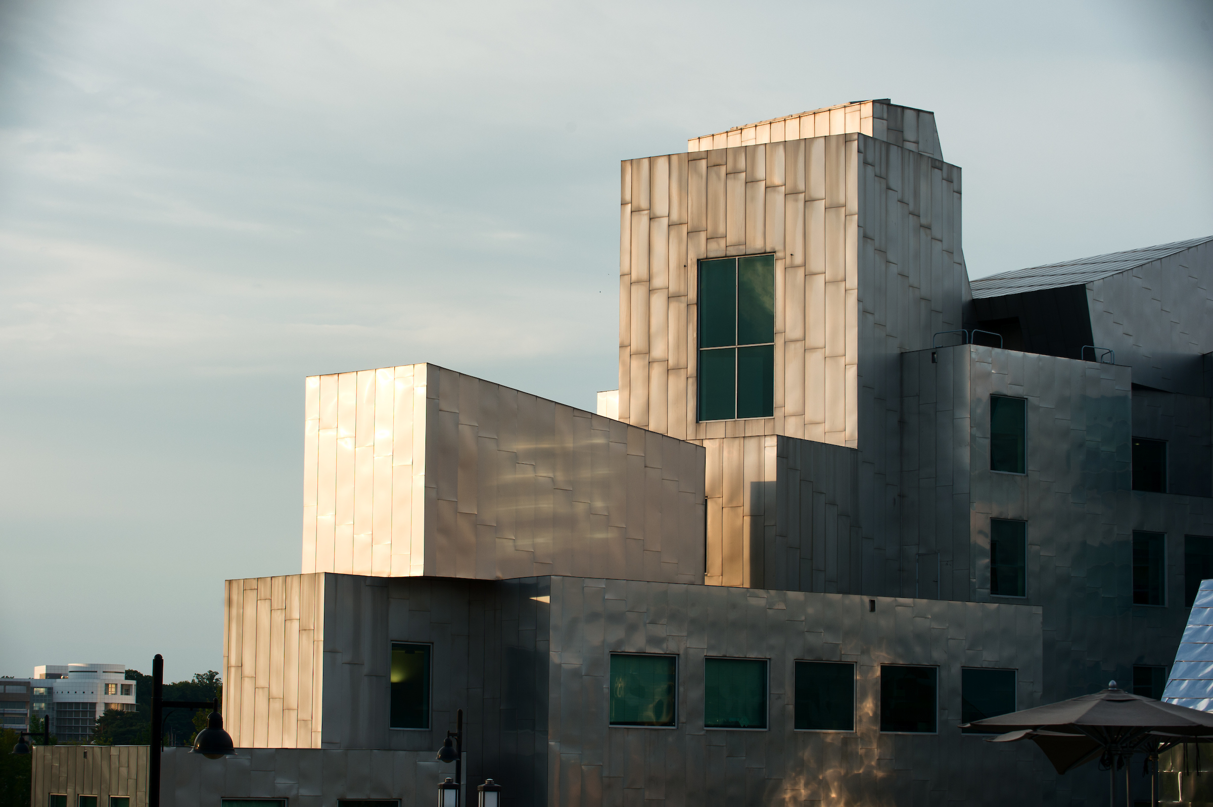 Most have come to know or hear about the catastrophic flood of the Iowa River in 2008. The $750 million disaster affected 22 major buildings on Iowa’s campus, including IATL. Years of hard work and federal negotiations allowed Iowa to repair the building and protect it from future flood risks. Nearly the entire stainless-steel exterior skin was removed and replaced as part of its recovery. While the floodwater only reached the first couple of feet of the ground floor, the design of Gehry’s overlapping steel “scales” required that the entire surface be taken off, if any one panel was removed. Additionally, while river waters only affected the base of the exterior walls, removal of the panels revealed water damage throughout, primarily from rainwater breaching the porous façade — a common shortfall of Gehry’s expressive designs. Replacement of the exterior walls also allowed them to be reconstructed with modern technologies that would effectively “button up” the exterior. As was quipped when finished, Iowa now had the first Gehry building that didn’t leak.