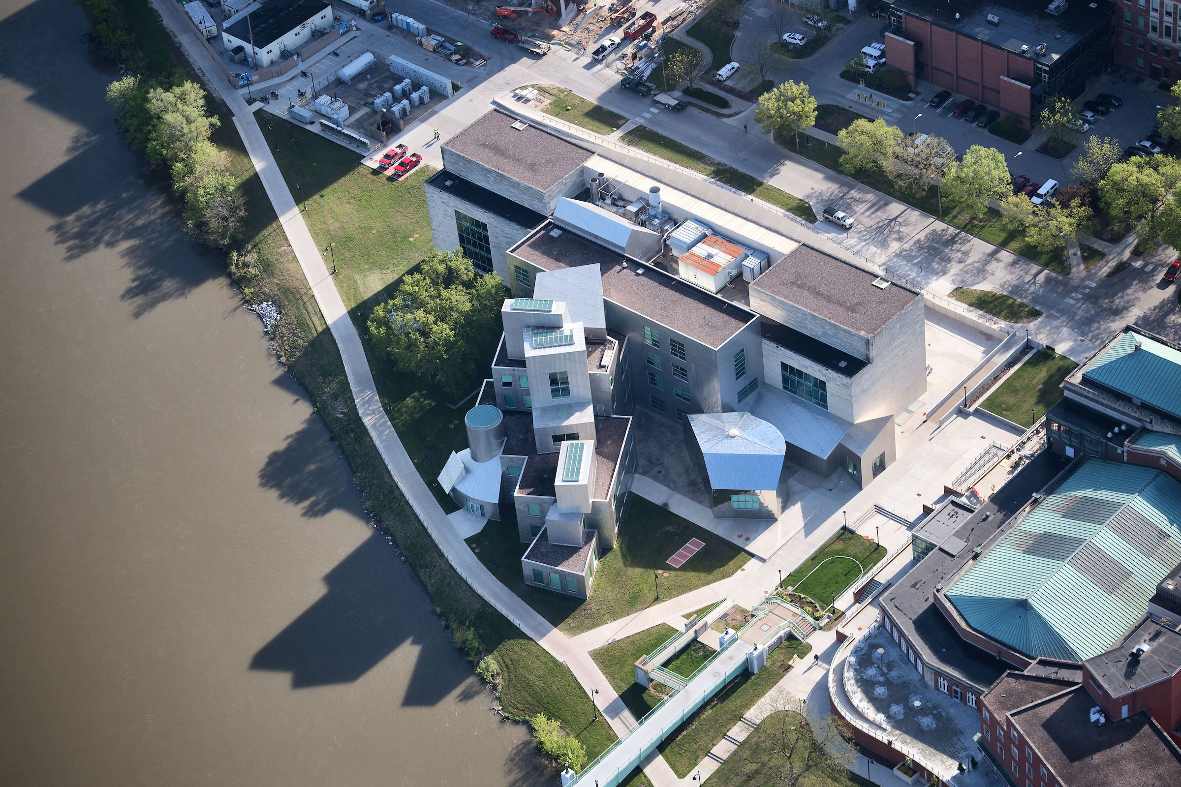 The completed foundation sat while fevered debates about making the building fit the budget took place. Eventually, a difficult and controversial decision was made to eliminate one of the wings of Gehry’s design. While the architect publicly complained about Iowa’s choice to alter his work of art, construction finally moved forward and was completed, sans one riverfront “cube.” IATL was finished and opened in 1992.