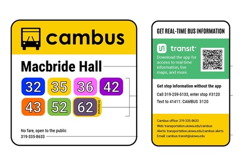 During the spring semester, Cambus will install new, easy-to-read signs that display routes by color and number, on-demand options, and local transit connections. The signs also include web, phone, and text info, as well as a QR code for the Transit app — making it easier to get real-time updates.